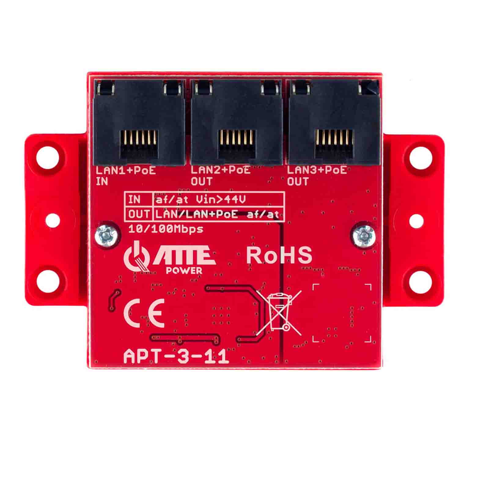 ATTE APT-3-11 to niezarządzalny przełącznik sieciowy PoE pracujący jako extender (repeater) sieci LAN oraz zasilania PoE. Najczęściej stosowany jako "aktywny rozdzielacz" w sytuacjach, gdy na jednym kablu UTP potrzebujemy uruchomić kilka urządzeń sieciowych (np. kilka kamer IP) lub gdy niezbędne jest dodatkowe odgałęzienie sieciowe Przeznaczony jest do współpracy z dowolnymi urządzeniami sieciowymi, kamerami IP oraz innymi zasilanymi w standardzie PoE 802.3at/af oraz PoE PASSIVE. Urządzenia serii APT (Atte Power Tree) zapewniają kompatybilność ze standardami IEEE 802.3.at/af zarówno jako odbiorniki zasilania PoE jak również na wszystkich portach wyjściowych. Po podłączeniu urządzenia do portu 2 lub 3 następuje identyfikacja odbiornika i jeżeli jest to urządzenie zasilane z PoE włączone zostanie zasilanie w porcie.