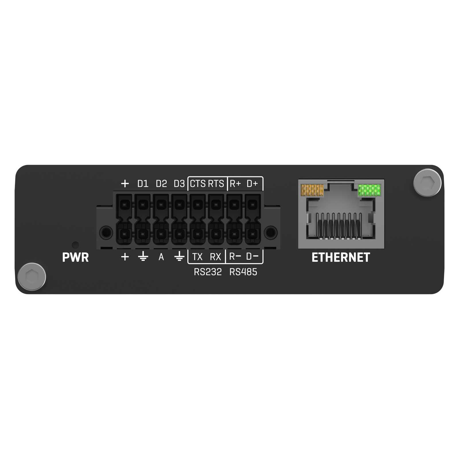 Teltonika TRB256 to kompaktowa, przemysłowa bramka LTE Cat M1/NB-IoT wyposażona w port Ethernet, blok złączy zawierający piny dla wejść/wyjść, RS232, RS485, GPS i oprogramowanie RutOS dla zaawansowanych rozwiązań sieciowych.