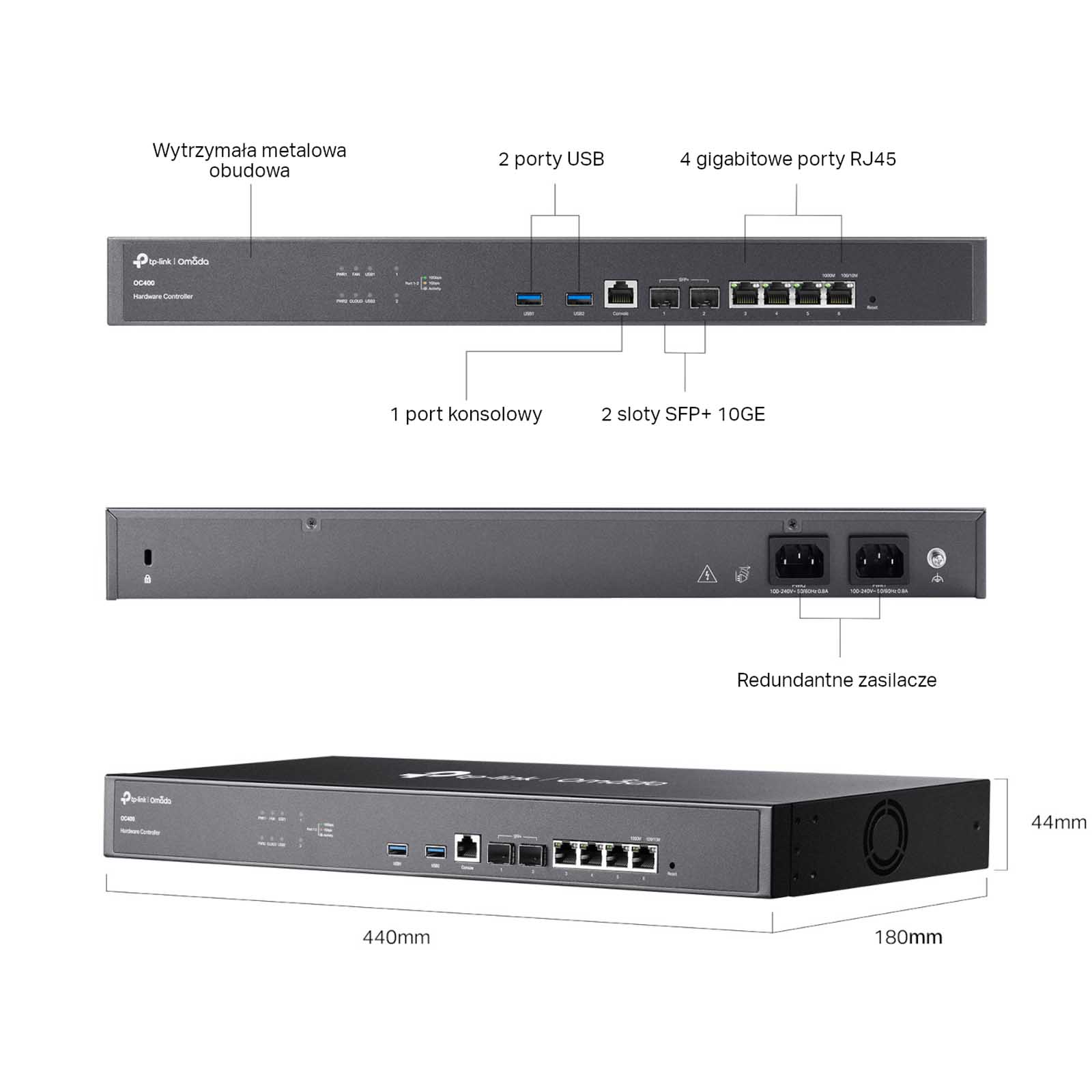 TP-Link OC400 Kontroler sprzętowy Omada służy do profesjonalnego centralnego zarządzania siecią, punktami dostępowymi, przełącznikami i bramami. Obsługuje do 1000 punktów dostępowych Omada, 200 przełączników Omada i 100 routerów Omada oraz do 30000 klientów.