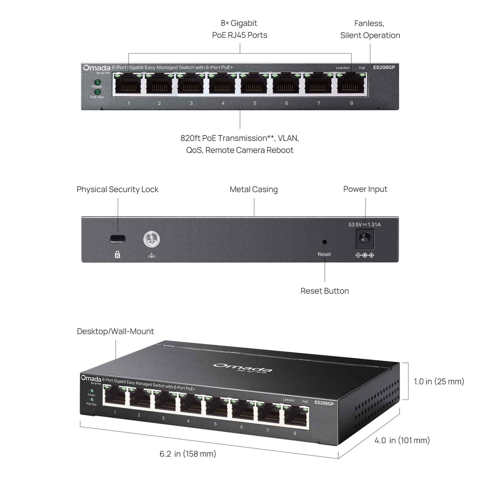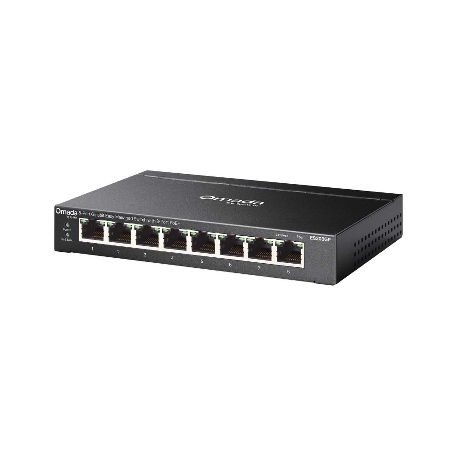 TP-Link ES208GP to zarządzalny przełącznik Omada Easy Managed, wyposażony w 8x portów Gigabit Ethernet 10/100/1000 Mb/s PoE+ zgodnych z 802.3at/af. Wszystkie porty obsługują automatyczną negocjację szybkości połączeń i automatyczne krosowanie Auto MDI/MDIX. Wydajnośc przełączania wynosi 16 Gb/s. Łączna moc zasilania wynosi do 64W, do 30W zasilania na każdym porcie PoE.