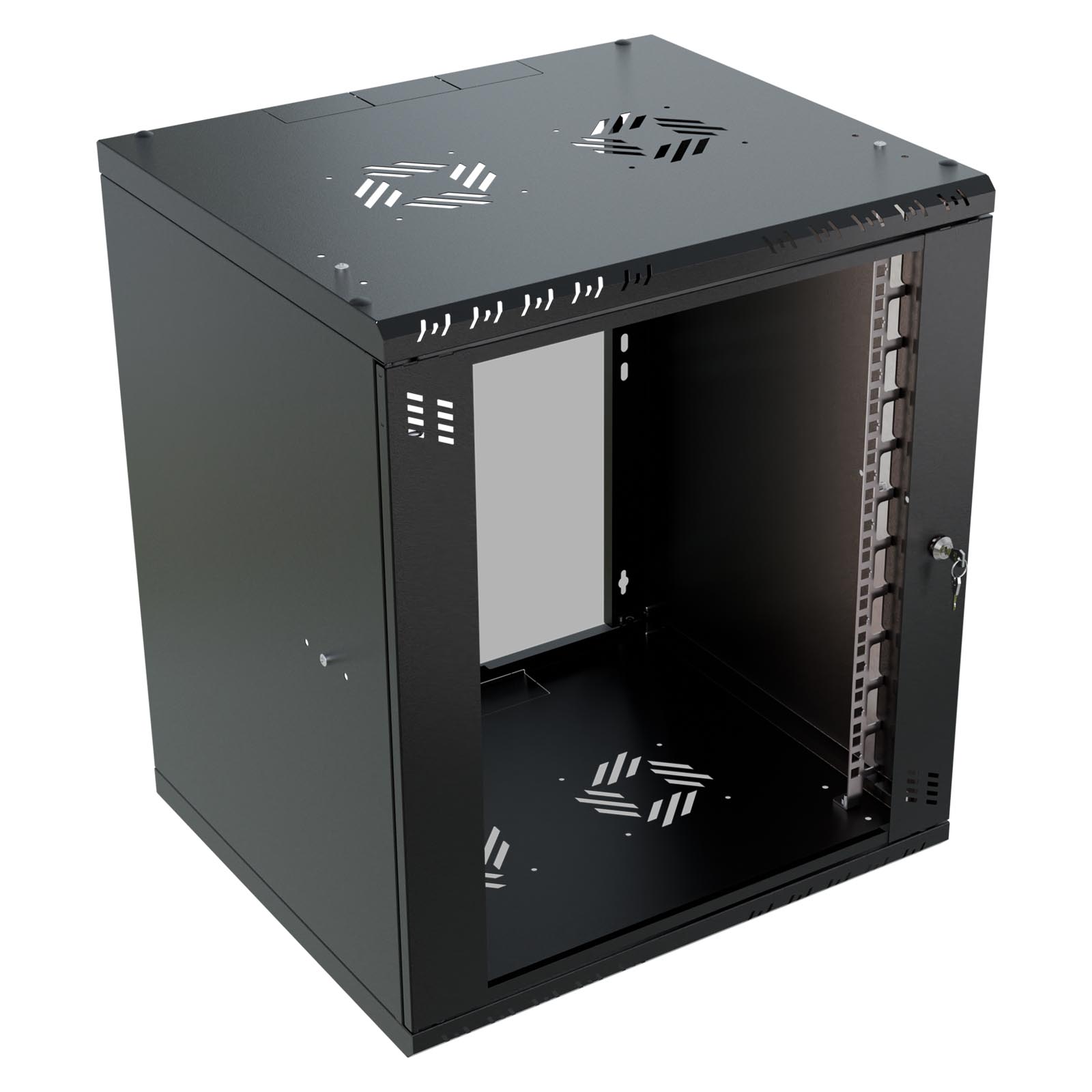 Szafę można łatwo przykręcić za pomocą kołków rozporowych (nie znajdują się w zestawie) dzięki otworom w tylnej części. Szafa umożliwia czteropunktowy montaż do ściany, co zwiększa jej stabilność. Drzwi można zamontować zarówno po prawej, jak i lewej stronie, a dzięki specjalnym zawiasom ze sprężyną ich montaż i demontaż jest niezwykle prosty. Szyny RACK można zamontować na trzech głębokościach, co pozwala na swobodne dopasowanie do urządzeń wewnątrz. W górnej i dolnej części znajdują się miejsca na wentylatory 120x120 mm (rozstaw otworów 105x105 mm), co zapewnia odpowiednie chłodzenie urządzeń. Dodatkowo, wyłamywane przepusty kablowe 50x80 mm (3 sztuki w górnej i 3 sztuki w dolnej części) ułatwiają zarządzanie okablowaniem. Szafa jest wyposażona w perforacje od frontu i po bokach, co jest kluczowe dla odprowadzania ciepła.