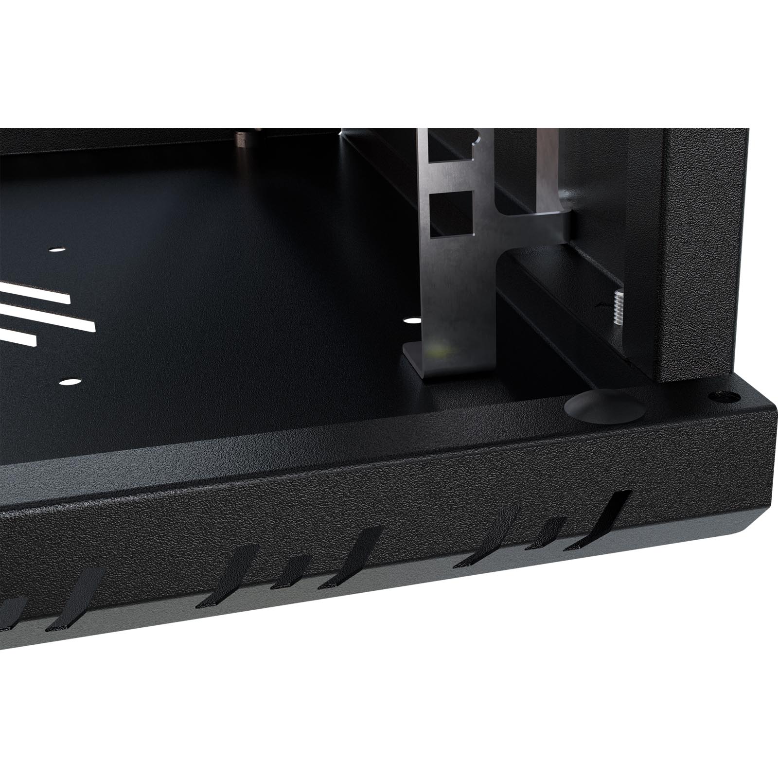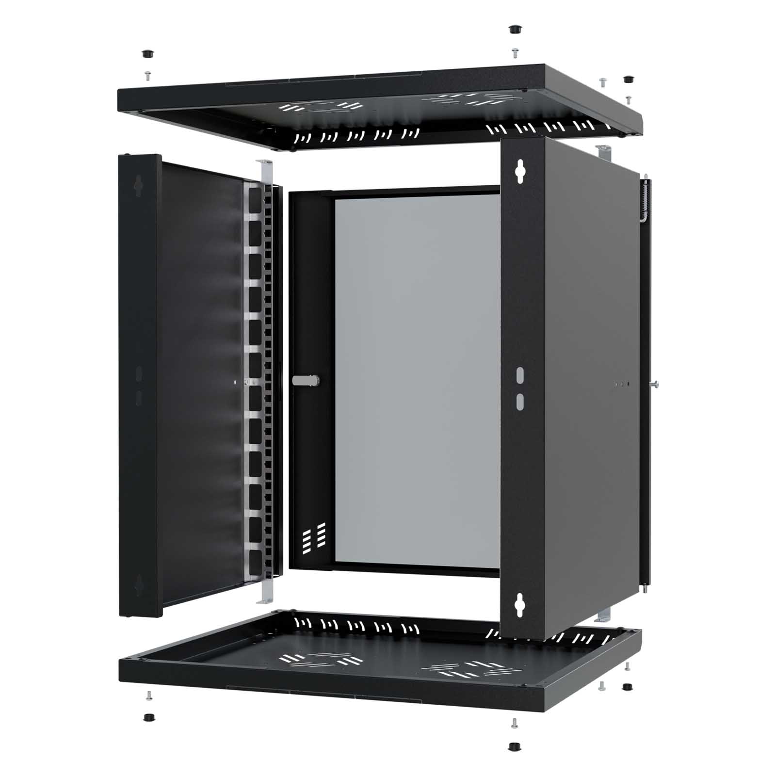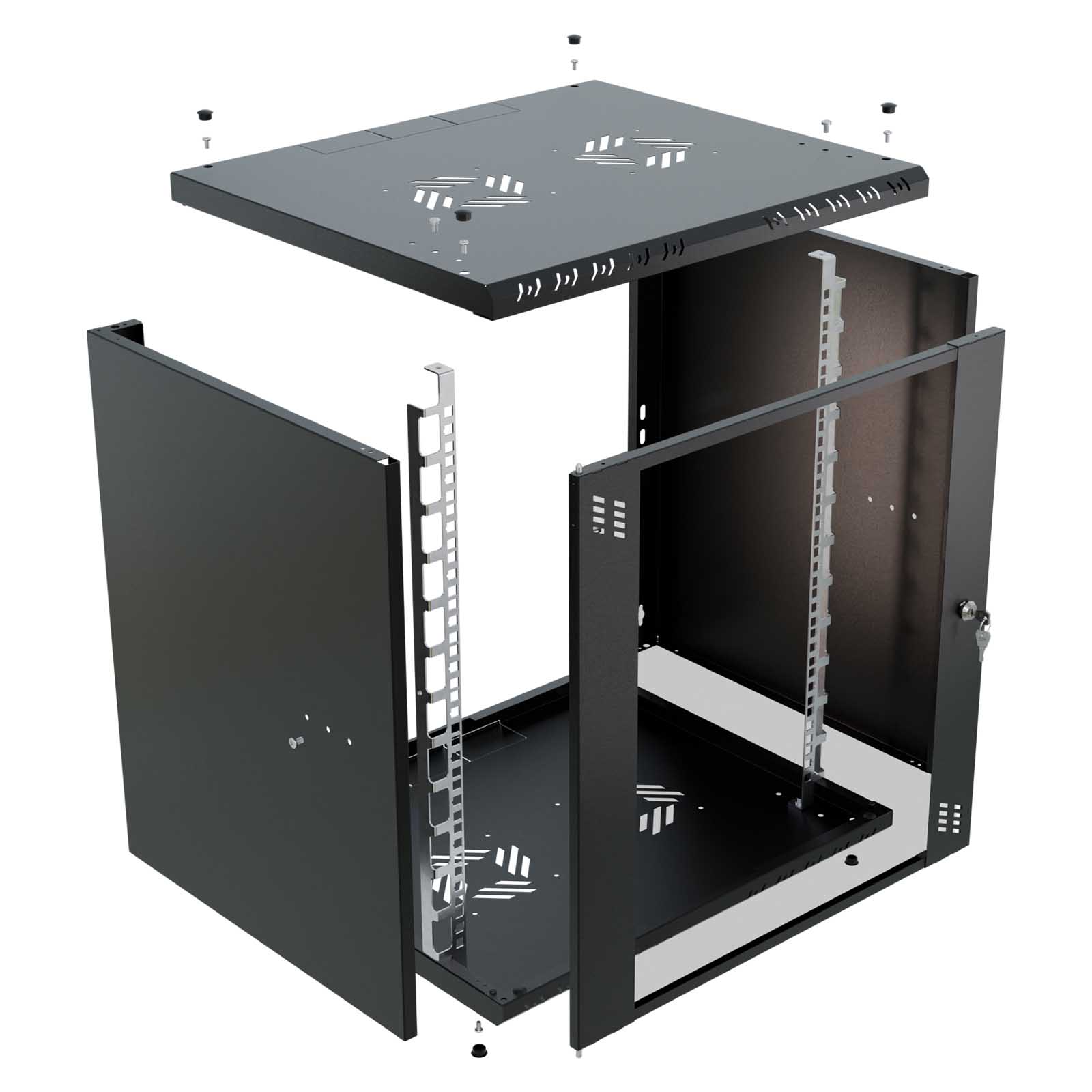 Szafa wykonana jest z blachy, która gwarantuje sztywność, a jednocześnie jest na tyle lekka, że jedna osoba może przeprowadzić instalację. Celowe usunięcie tylnej ściany umożliwia wygodną modernizację oraz zapewnia łatwy dostęp do okablowania wychodzącego ze ściany. Liczne otwory w szynach RACK pozwalają na łatwe przeprowadzenie okablowania. Dzięki swojej kompaktowej szerokości wynoszącej zaledwie 520 mm, szafa idealnie nadaje się do miejsc o ograniczonej przestrzeni, pozostając w pełni funkcjonalną.