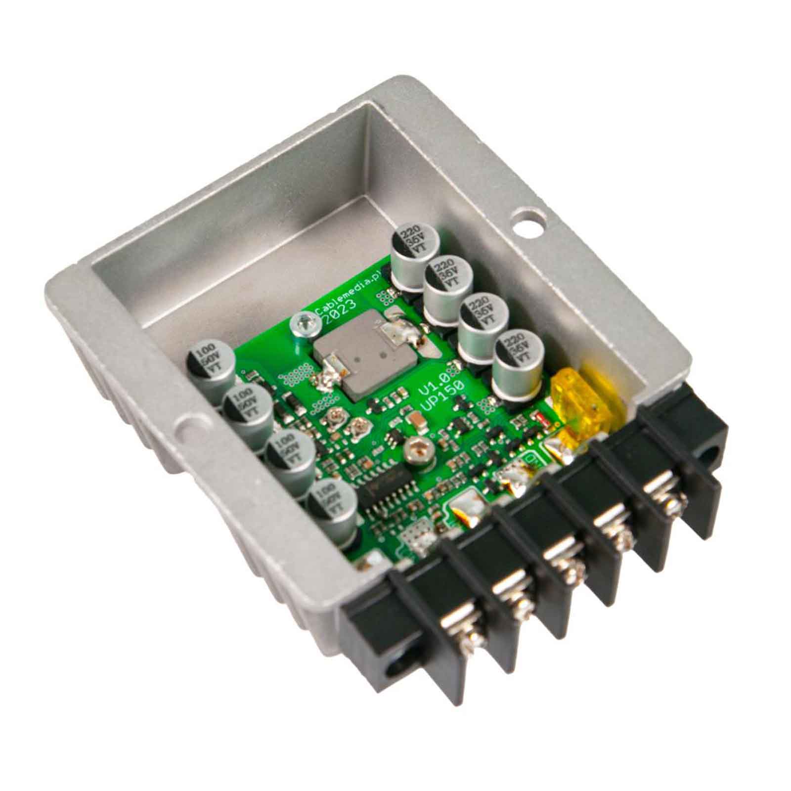 Przetwornica podnosząca napięcie Cablemedia UP-150-12/24 podnosi napięcie z 12 V DC na 24 V DC. Maksymalna moc wyjściowa wynosi 150 W, prąd 0-6 A. Produkt został zamknięty w niewielkiej, metalowej obudowie, po bokach posiada 2 otwory montażowe (rozstaw 65 mm).