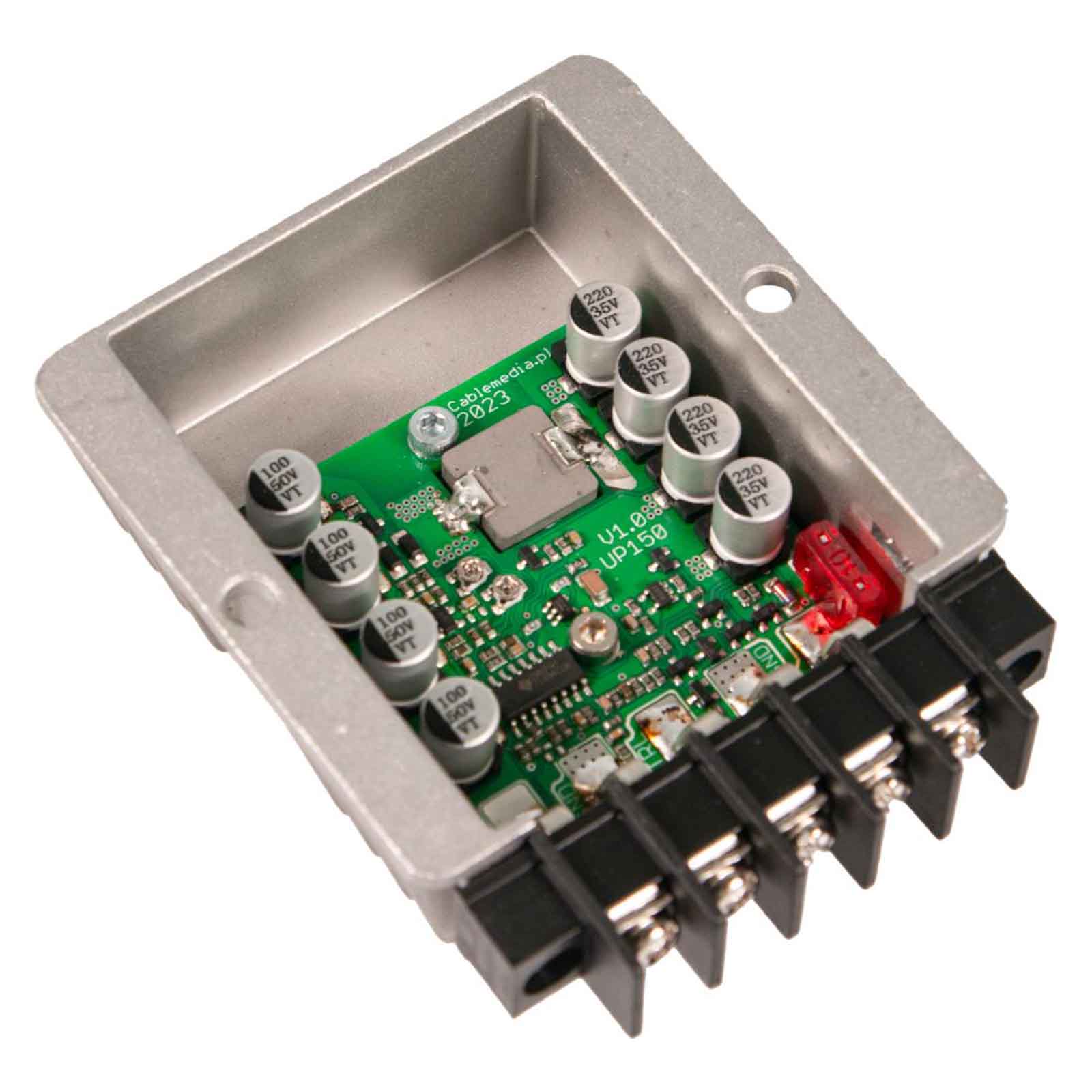 • Przetwornica podnosząca napięcie Cablemedia UP-150-24/48 podnosi napięcie z 24 V DC na 48 V DC. Maksymalna moc wyjściowa wynosi 150 W, prąd 0-3 A. Produkt został zamknięty w niewielkiej, metalowej obudowie, po bokach posiada 2 otwory montażowe (rozstaw 65 mm).