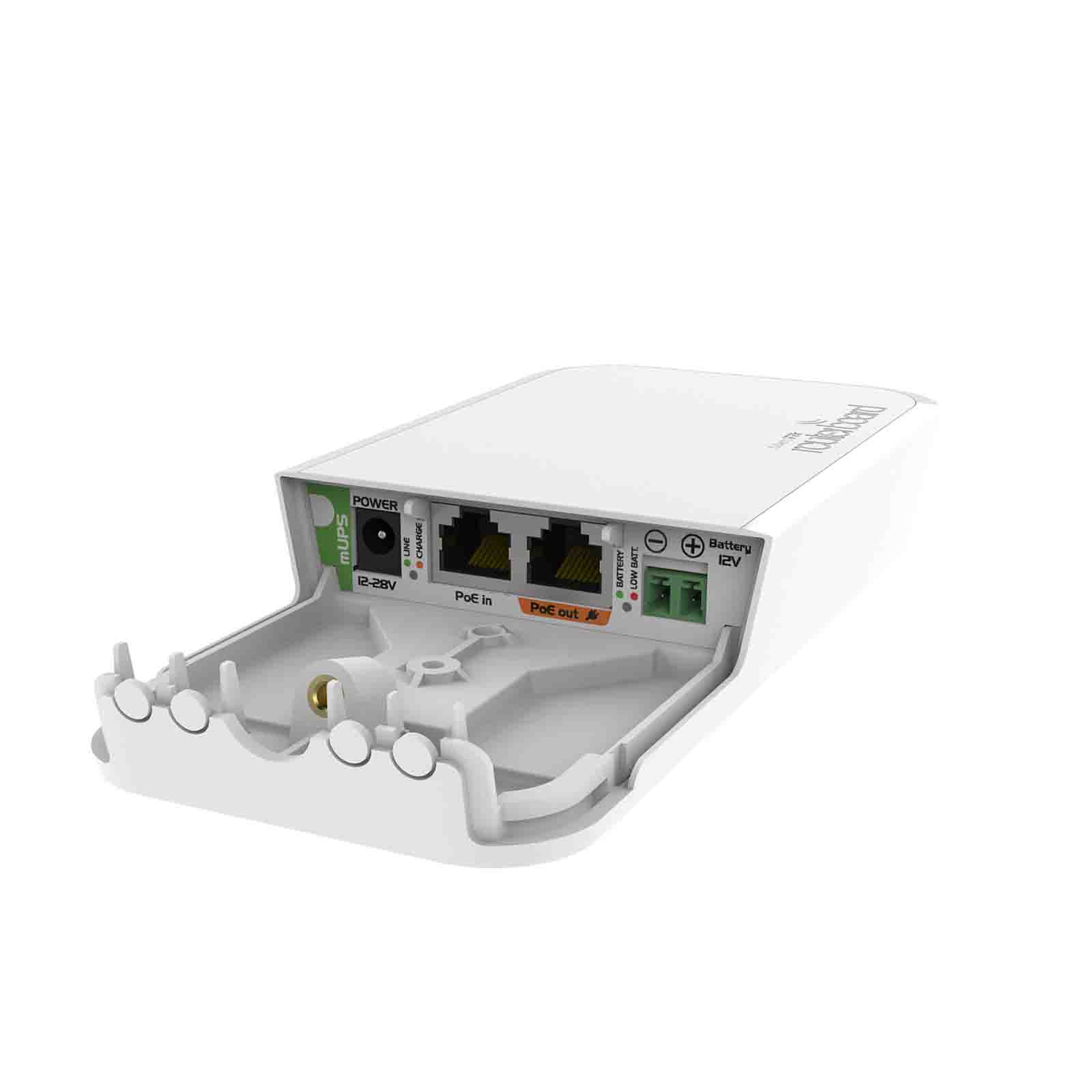 MikroTik mUPS to gigabitowy PoE injector z możliwością pracy buforowej. Może być zasilany poprzez pasywne PoE lub wtyk DC, zakres napięcia wynosi 12 - 28 V DC. Oprócz tego posiada drugi gigabitowy port Ethernet, który służy jako wyjście PoE. Do urządzenia można podłączyć standardowy akumulator 12 V, w przypadku utraty głównego zasilania mUPS automatycznie przełączy się na zasilanie awaryjne. Diody LED informują o sposobie zasilania (zasilanie główne lub liniowa), ładowaniu akumulatora oraz niskim naładowaniu akumulatora (poniżej 50%).