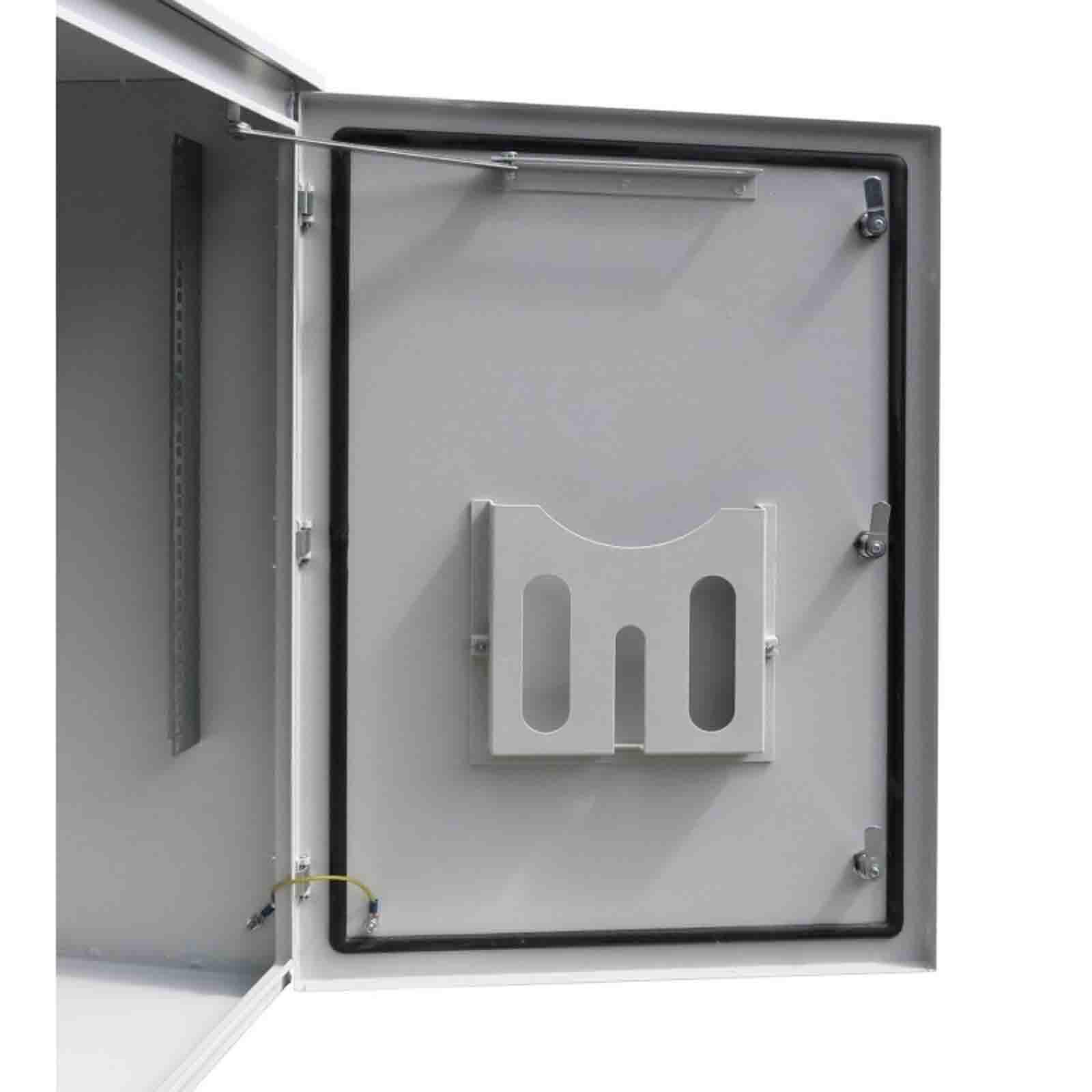- Standardowo wyposażona w 6 otworów ø24 mm, usytuowanych w dolnej ściance, zaślepionych dławikami hermetycznymi