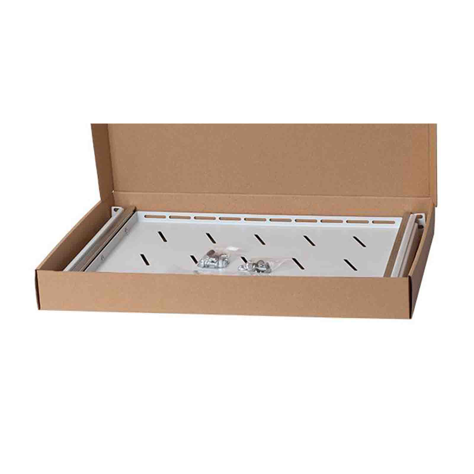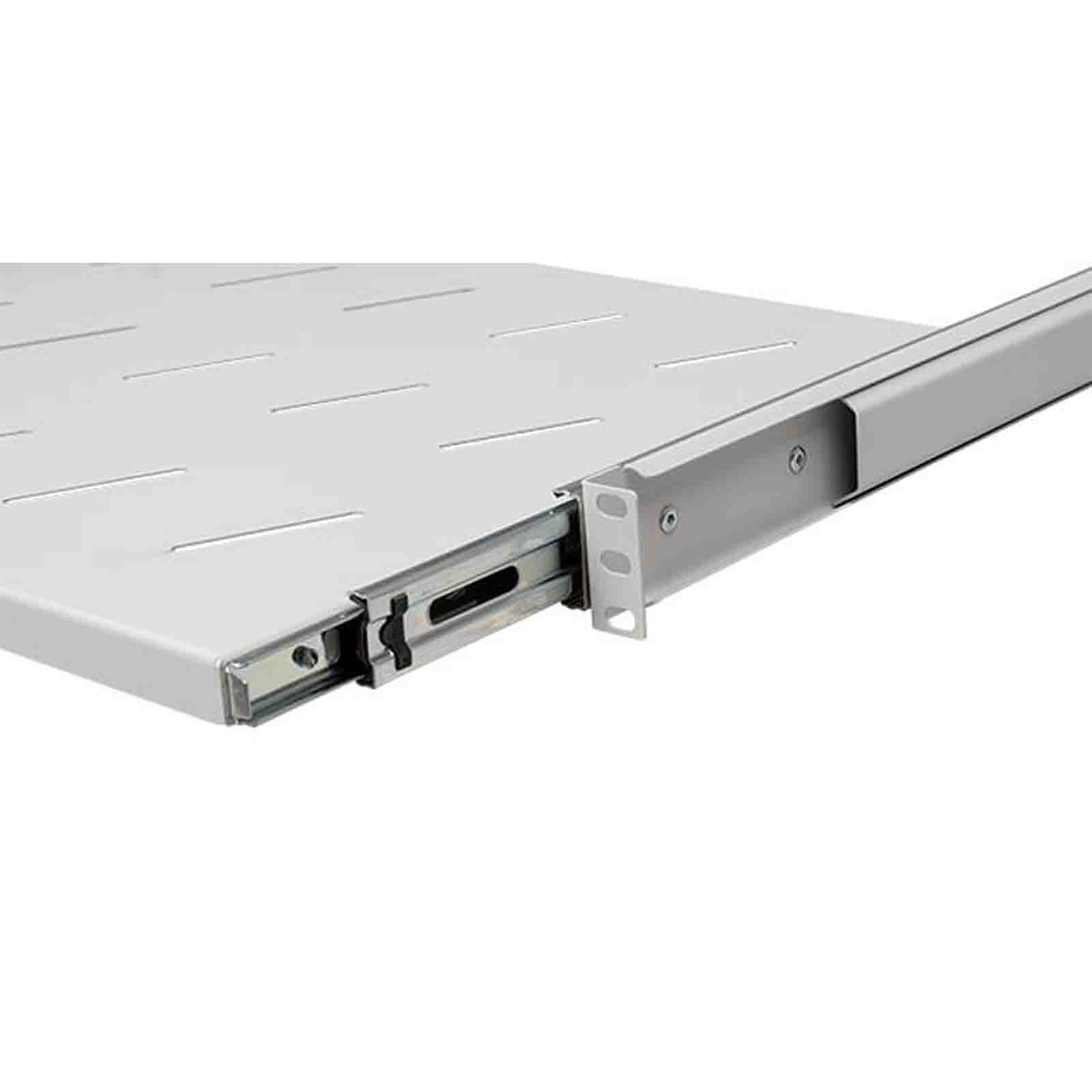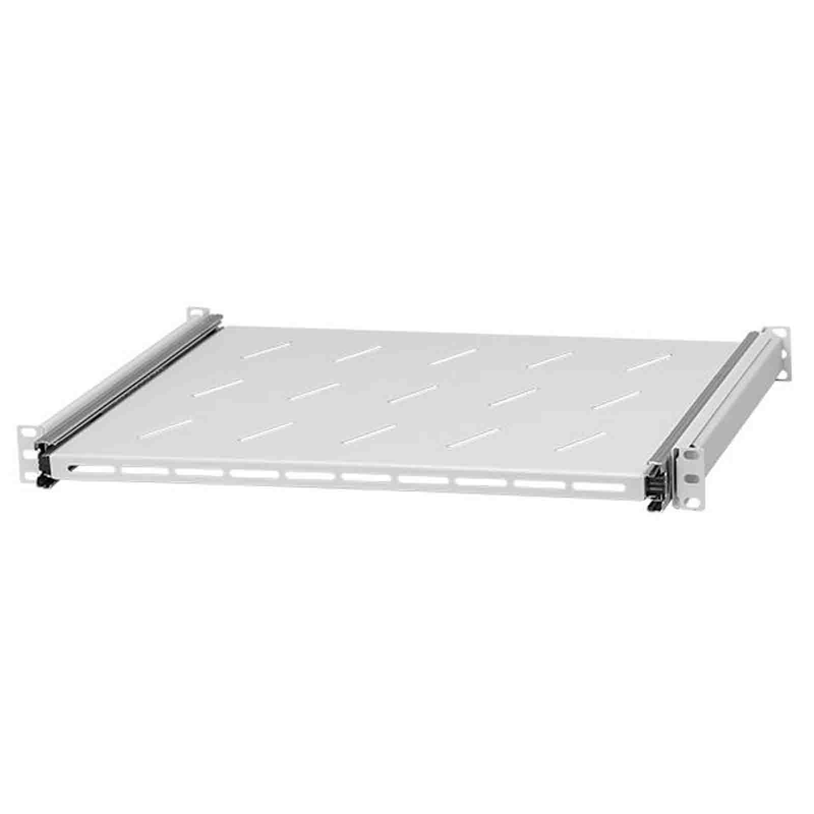 Półka o głębokości 350 mm przeznaczona do montażu w szafach RACK 19". Pozwala na umieszczanie w szafie urządzeń niezgodnych ze standardem 19" lub nieposiadających dedykowanych uchwytów montażowych. Półkę można zamontować w szynach o rozstawie od 350 do 700 mm. Regulacja rozstawu montażowego jest w pełni płynna i nie wymaga dodatkowych prac poza wysunięciem na interesującą długość. Wygodę i lekkość użytkowania gwarantują metalowe prowadnice umożliwiające pełen wysuw półki.