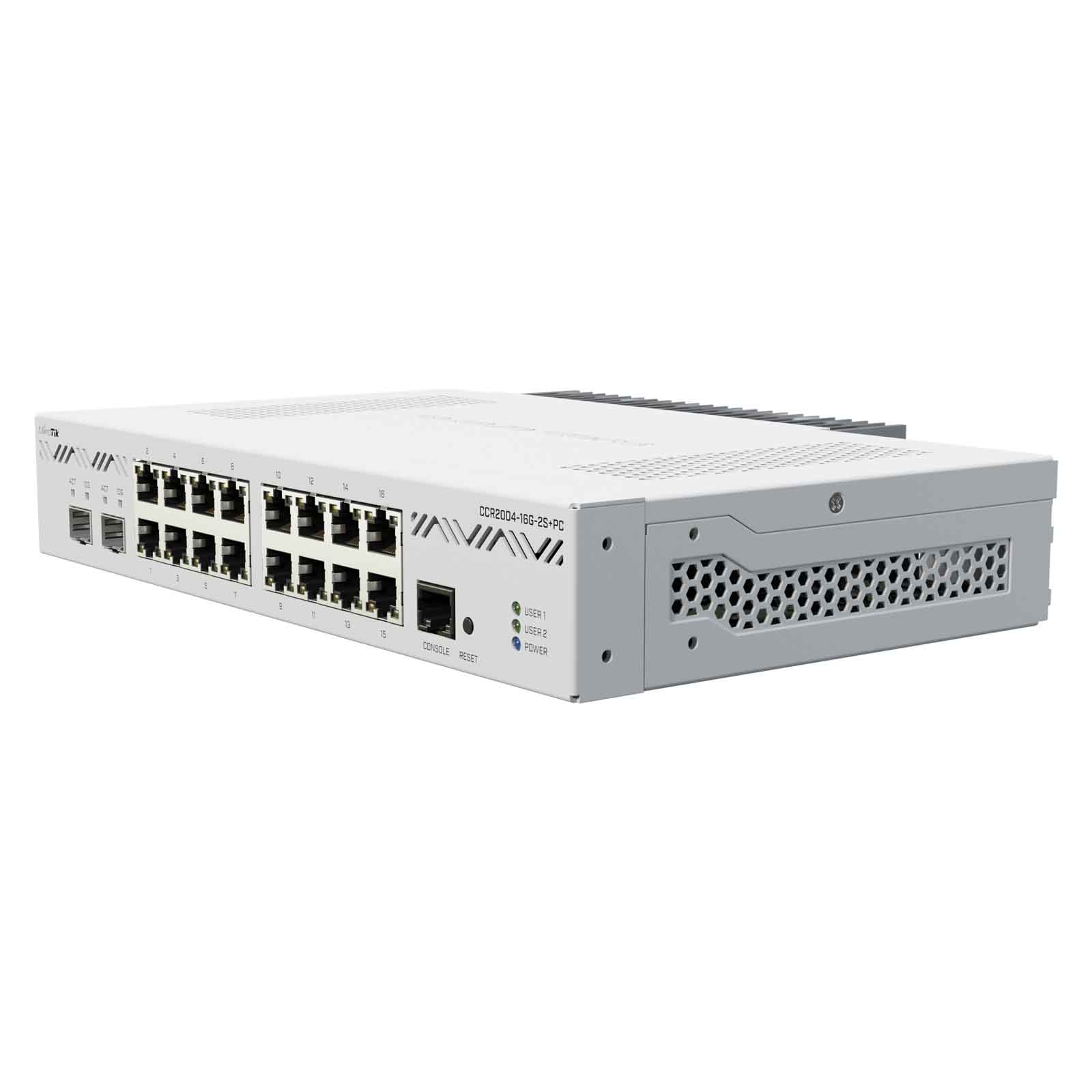 MikroTik Cloud Core Router CCR2004-16G-2S+PC to wydajny i niedrogi router serii CCR MikroTika. Bliźniacza wersja modelu CCR2004-16G-2S+, różniąca się chłodzeniem pasywnym. Router wyposażony jest w 16x portów Gigabit Ethernet, 2x sloty 10G SFP+, port konsolowy RJ45, chłodzenie pasywne oraz posiada wysoką wydajność pojedynczego rdzenia na wat i wysoką wydajność na wat spośród wszystkich urządzeń CCR. Doskonale sprawdzi się w większości sieci internetowych. Jak wszystkie urządzenia CCR, posiada klasyczną białą obudowę typu desktop, dostosowaną do montażu w szafie rack 19" (w zestawie znajdują się uszy). Podobnie jak inne modele z serii CCR2004, CCR2004-16G-2S+PC jest również wyposażony w procesor Annapurna Labs Alpine v2 z 4x 64-bitowymi rdzeniami ARMv8-A Cortex-A57 pracującymi z częstotliwością 1,2 GHz. Czym się wyróżnia? Ten potężny router pokonuje wszystkie poprzednie modele CCR w wydajności jednordzeniowej, a to jest najważniejszy aspekt, jeśli chodzi o skomplikowane operacje oparte na przetwarzaniu na połączenie. Każda grupa 8 portów Gigabit Ethernet jest podłączona do oddzielnego układu przełączników rodziny Marvell Amethyst. Każdy układ przełącznika ma pełnodupleksową linię 10 Gb/s podłączoną do procesora. To samo dotyczy każdego slotu SFP+ – oddzielnej linii pełnodupleksowej 10 Gb/s. Płyty są dostarczane z 4 GB pamięci RAM DDR4 i 128 MB pamięci NAND. CCR posiada system RouterOS z licencją Level 6. Pod względem wydajności CCR2004-16G-2S+PC jest na równi z renomowanymi routerami CCR1009 oraz CCR1016. MikroTik Cloud Core Router CCR2004-16G-2S+ jest jedną z najtańszych opcji na rynku - nie tylko w serii CCR, ale ogólnie na rynku.
