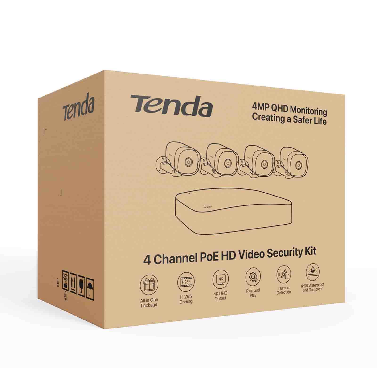 Tenda K4P-4TR to 4-kanałowy zestaw monitoringu wizyjnego HD PoE. Zestaw K4P-4TR zawiera jeden rejestrator sieciowy PoE oraz cztery kamery bezpieczeństwa typu bullet PoE. Łączy takie funkcje, jak praca zaraz po podłączeniu, jakość obrazu 4MP HD, noktowizja na podczerwień, wykrywanie ludzi dzięki AI, dekodowanie wideo H.265 o wysokiej wydajności, izolowanie uszkodzonych części dysku twardego, kanałowe przechowywanie w chmurze, wodoodporność i pyłoszczelność na poziomie IP67 (dla kamer) oraz zdalny monitoring w aplikacji. Oferuje kompleksowe rozwiązania dla małego monitoringu, na przykład w domach jednorodzinnych, sklepach, restauracjach, biurach, szkołach, fabrykach czy farmach. Dzięki wysokiej klasy sensorowi obrazu CMOS 4MP rozdzielczość może osiągnąć 2560x1440p. Noktowizja na podczerwień o zasięgu 50 metrów umożliwia nagrywanie w wysokiej jakości nawet w ciemnym otoczeniu lub na bardzo dużą odległość. Wyjście 4K HDMI oraz rozdzielczość UHD 3840x2160p zapewniają wyraźne obrazy z większą liczbą detali nawet na zbliżeniach.